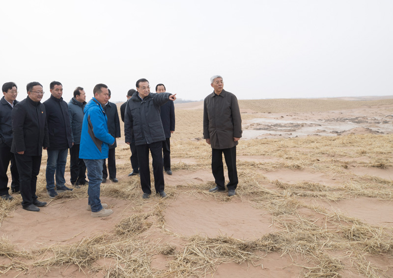 在武威市民勤县草方格固沙点,李克强听取甘肃防沙治沙工作汇报,对干部群众和全国各地志愿者共同努力取得的成效表示肯定。他说,防沙治沙是改善生态和当地群众生产生活环境的大事,国家将继续支持,加大投入。要加强科技研发推广,培育更多固沙植物品种,促进形成生物多样的固沙生态。