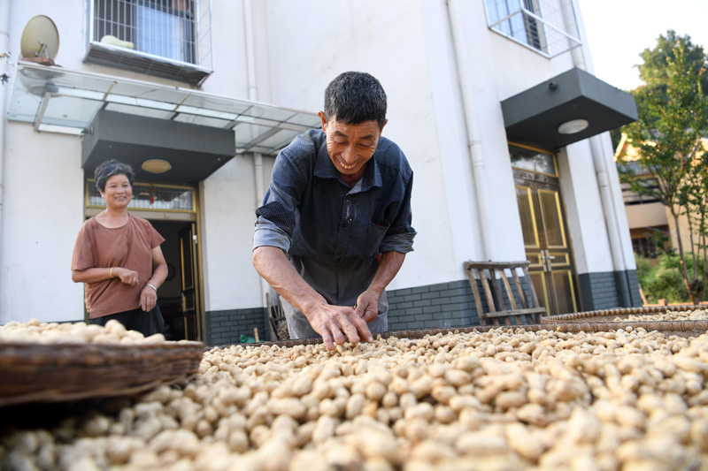 安徽省金寨县大湾村村民在自家新房前晾晒花生(2019年9月3日摄)。新华社记者 鲍菲菲 摄